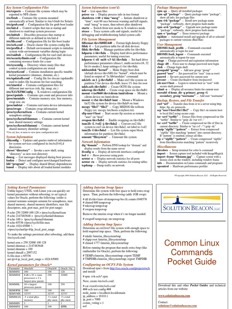 lsof List open files pstree -ca Display process info in tree format shutdown -t 60 -r time mesg Initiate shutdown at time, wait 60 secs between warning and kill signals, send mesg to users, then reboot after shutdown startx Switch from text mode to X-windows mode strace Trace system calls and signals, useful for debugging and troubleshooting failed system calls fdformat /dev/fd0H1440 Format high density floppy fdisk -l List partition table for all disk devices fdisk /dev/hda Manage partition table for /dev/hda hdparm -i /dev/hda Display hard drive performance parameters; useful for tuning exercises hdparm -i -d1 -m16 -c3 -k1 /dev/hda Set hard drive performance parameters (dma=1, multi-sectors=16, 32 bit i/o mode=3, keep settings=1) for /dev/hda mkbootdisk kernel Make floppy boot disk (default device /dev/fd0) for kernel, which must be listed in output of ls /lib/modules command mk2efs -m 1 -j /dev/hdb5 Make ext3 file system on partition 5 for device /dev/hdb, leave 1% free for root mkfs.ocfs /dev/hdb1 Create OCFS file system mkswap /dev/hdb1 Create swap space on /dev/hdb1 mount -t iso9660 /dev/cdrom /mnt/cdrom Mount a cdrom device on /mnt/cdrom mount -t vfat /dev/hda9 /mnt Mount a Windows fat32 file system for device /dev/hda9 on /mnt mcopy file1 file2 Copy MSDOS file to/from floppy (ex: mcopy /etc/hosts a:myhost.txt) sftp user@host Start secure ftp session as remote user on host swapon /dev/hdb1 Enable swapping on /dev/hdb1 tune2fs -L /vol2 -j /dev/hda2 Convert ext2 file system to ext3 on device /dev/hda2, set label to /vol2 tune2fs -l /dev/hda1 List file system super block information for partition /dev/hda1 umount filesystem Unmount file system