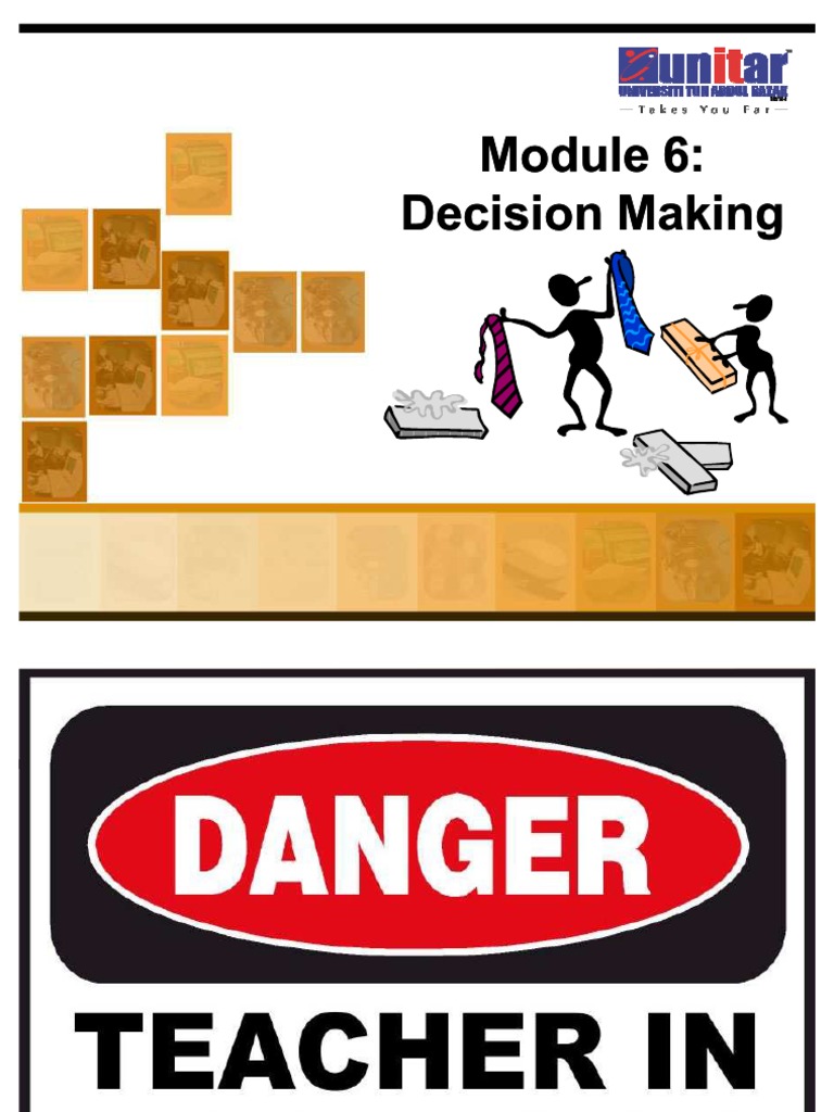 Courseware - Module 4: Decision Making http://cw.unitar.edu.my/ugb2013/c4/index.htm Decision Making: http://en.wikipedia.org/wiki/Decision_making SWOT Analysis: http://en.wikipedia.org/wiki/SWOT_Analysis SWOT Tutorial: http://www.nelh.nhs.uk/folio/mchip/swot.pps SWOT Templates: http://www.businessballs.com/swotanalysisfreetemplate.htm Teacher in Bad Mood: http://www.sbac.edu/~tpl/clipart/Signs%20and%20Symbols/danger%200 2.jpg Punk: http://www.rarepunk.com/images/punkrocker2.jpg Siti Nurhaliza: http://i31.photobucket.com/albums/c369/bukaninsanbiasa/ctmelayumera h.jpg Angry Teacher: http://www.webweaver.nu/clipart/img/education/angryteacher.gif