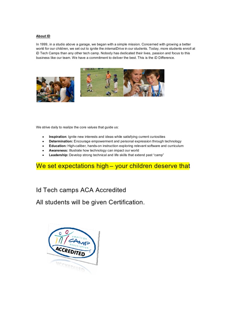 Id Tech camps ACA Accredited All students will be given Certification.