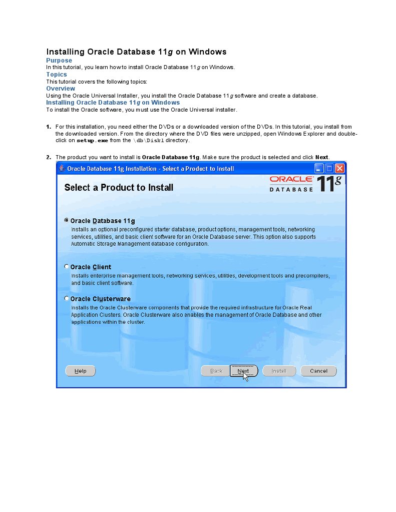 To install the Oracle software, you must use the Oracle Universal installer. 1. For this installation, you need either the DVDs or a downloaded version of the DVDs. In this tutorial, you install from the downloaded version. From the directory where the DVD files were unzipped, open Windows Explorer and doubleclick on setup.exe from the \db\Disk1 directory. 2. The product you want to install is Oracle Database 11g. Make sure the product is selected and click Next.