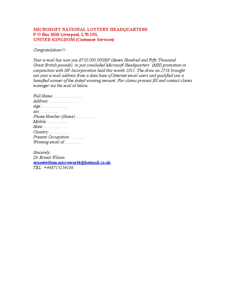 Your e-mail has won you 750,000.00GBP (Seven Hundred and Fifty Thousand Great British pounds), in just concluded Microsoft Headquarters (MH) promotion in conjunction with HP Incorporation held this month 2011. The draw no.2758 brought out your e-mail address from a data base of Internet email users and qualified you a bonafied winner of the stated winning amount. For claims process fill and contact claims manager via the mail id below, Full Name:.......................... Address:.......................... Age:....................... sex:................. Phone Number (Home):................. Mobile:.................. State:................ Country:.................. Present Occupation:............. Winning email id:.............. Sincerely, Dr Ernest Wilson. ernestwilson.microworld@hotmail.co.uk TEL: +448713154186