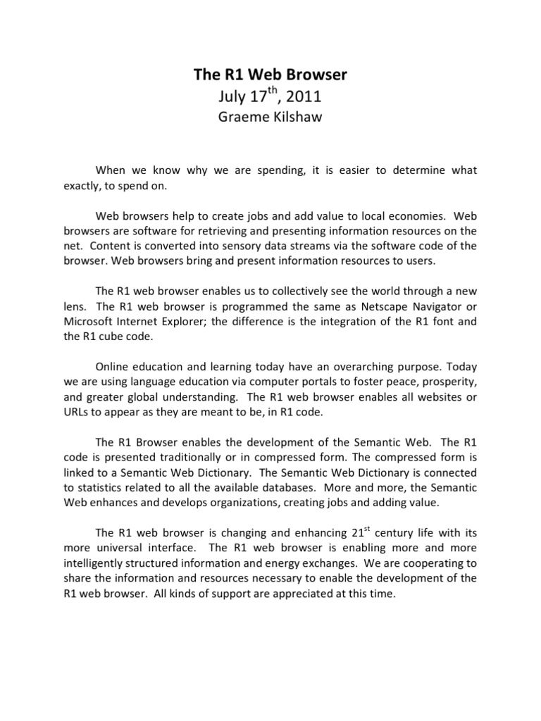 When we know why we are spending, it is easier to determine what exactly, to spend on. Web browsers help to create jobs and add value to local economies. Web browsers are software for retrieving and presenting information resources on the net. Content is converted into sensory data streams via the software code of the browser. Web browsers bring and present information resources to users. The R1 web browser enables us to collectively see the world through a new lens. The R1 web browser is programmed the same as Netscape Navigator or Microsoft Internet Explorer; the difference is the integration of the R1 font and the R1 cube code. Online education and learning today have an overarching purpose. Today we are using language education via computer portals to foster peace, prosperity, and greater global understanding. The R1 web browser enables all websites or URLs to appear as they are meant to be, in R1 code. The R1 Browser enables the development of the Semantic Web. The R1 code is presented traditionally or in compressed form. The compressed form is linked to a Semantic Web Dictionary. The Semantic Web Dictionary is connected to statistics related to all the available databases. More and more, the Semantic Web enhances and develops organizations, creating jobs and adding value. The R1 web browser is changing and enhancing 21st century life with its more universal interface. The R1 web browser is enabling more and more intelligently structured information and energy exchanges. We are cooperating to share the information and resources necessary to enable the development of the R1 web browser. All kinds of support are appreciated at this time.