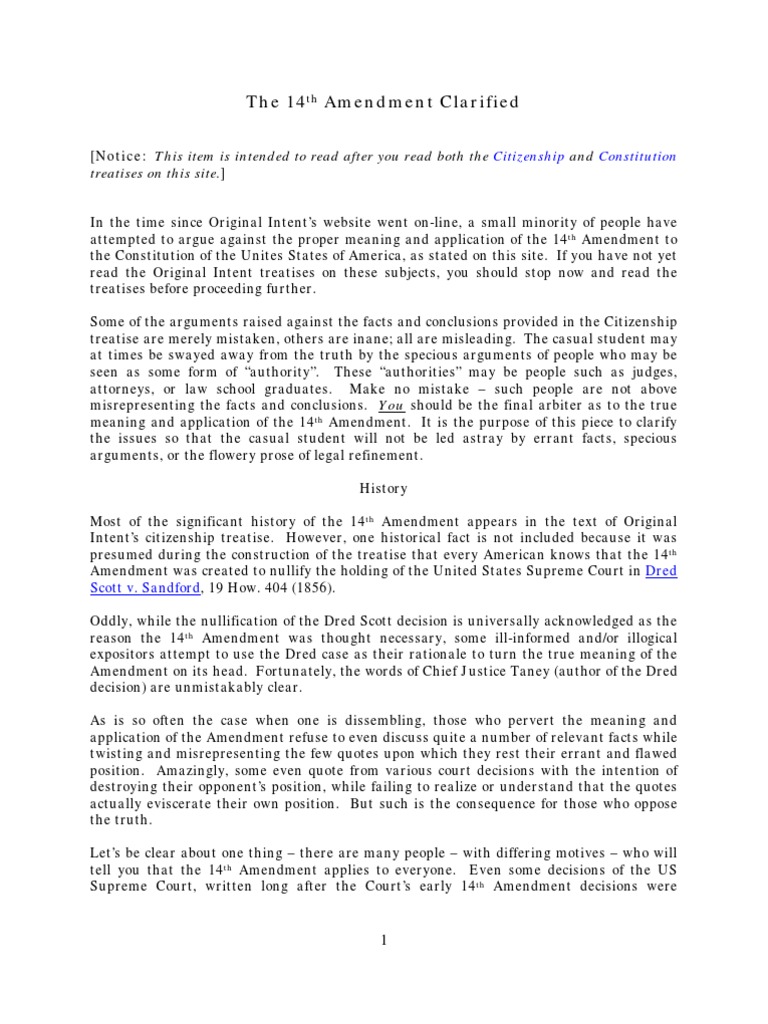 [Notice: This item is intended to read after you read both the Citizenship and Constitution treatises on this site.] In the time since Original Intents website went on-line, a small minority of people have attempted to argue against the proper meaning and application of the 14th Amendment to the Constitution of the Unites States of America, as stated on this site. If you have not yet read the Original Intent treatises on these subjects, you should stop now and read the treatises before proceeding further. Some of the arguments raised against the facts and conclusions provided in the Citizenship treatise are merely mistaken, others are inane; all are misleading. The casual student may at times be swayed away from the truth by the specious arguments of people who may be seen as some form of authority. These authorities may be people such as judges, attorneys, or law school graduates. Make no mistake such people are not above misrepresenting the facts and conclusions. You should be the final arbiter as to the true meaning and application of the 14th Amendment. It is the purpose of this piece to clarify the issues so that the casual student will not be led astray by errant facts, specious arguments, or the flowery prose of legal refinement. History Most of the significant history of the 14th Amendment appears in the text of Original Intents citizenship treatise. However, one historical fact is not included because it was presumed during the construction of the treatise that every American knows that the 14th Amendment was created to nullify the holding of the United States Supreme Court in Dred Scott v. Sandford, 19 How. 404 (1856). Oddly, while the nullification of the Dred Scott decision is universally acknowledged as the reason the 14th Amendment was thought necessary, some ill-informed and/or illogical expositors attempt to use the Dred case as their rationale to turn the true meaning of the Amendment on its head. Fortunately, the words of Chief Justice Taney (author of the Dred decision) are unmistakably clear. As is so often the case when one is dissembling, those who pervert the meaning and application of the Amendment refuse to even discuss quite a number of relevant facts while twisting and misrepresenting the few quotes upon which they rest their errant and flawed position. Amazingly, some even quote from various court decisions with the intention of destroying their opponents position, while failing to realize or understand that the quotes actually eviscerate their own position. But such is the consequence for those who oppose the truth. Lets be clear about one thing there are many people with differing motives who will tell you that the 14th Amendment applies to everyone. Even some decisions of the US Supreme Court, written long after the Courts early 14th Amendment decisions were