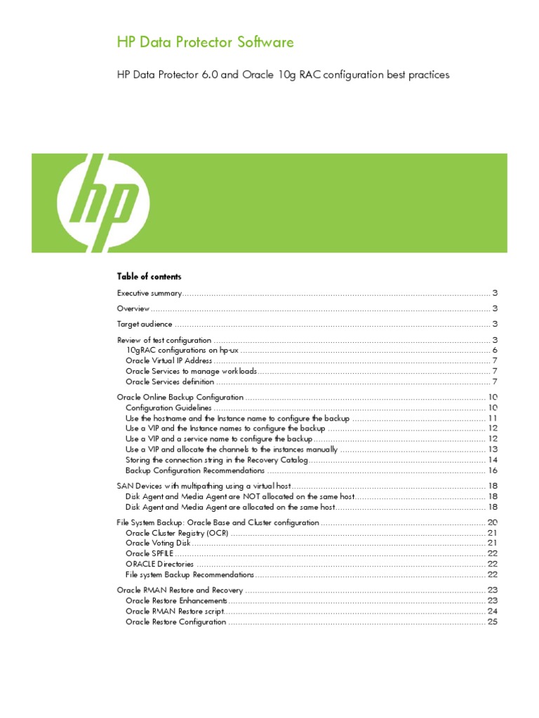 This white paper provides guidance and best practices for performing backup and restore of Oracle 10g Real Application Clusters using HP Data Protector Software. Since the release of Oracle 9i Real Application Clusters, there has always been uncertainty about what needs to be backed up and how to backup the RAC database. We will try to address these questions throughout this paper. This paper is not: Intended to replace the HP Software Data Protector installation and integration guides with Oracle A performance whitepaper on backup and recovery of Oracle Real Application Clusters A step-by-step installation and configuration guide