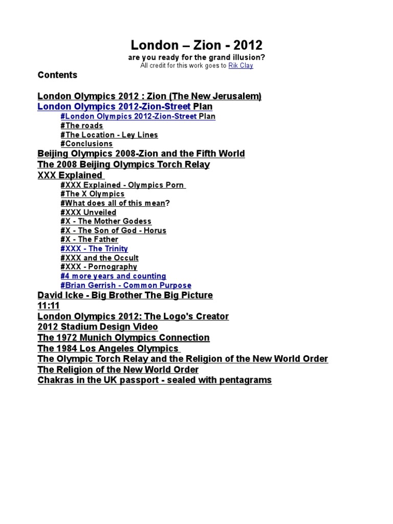 When the logo for the London Olympics was unveiled in June 2007 at the cost of £400,000there was significant public uproar due to both the cost and how terrible it looked.Despite public pressure, the International Olympic Committee stood fast on keeping thelogo, with no flexibility. In other words, this particular logo was very important. Why?There are many interpretations spread about the net, all intended to dissolve the truesymbolic meaning behind the logo. It has been claimed to look like a swastika, a runner and even Lisa Simpson but these are all ridiculous diversions.On first glance you can easily make out the numbers 2012, but why the random 'dot'?Here's why...Are we to believe that the London 2012 Olympics are going to facilitate the implementationof Zion - the 'New Jerusalem'?To recite William Blake's poem 'Jerusalem':