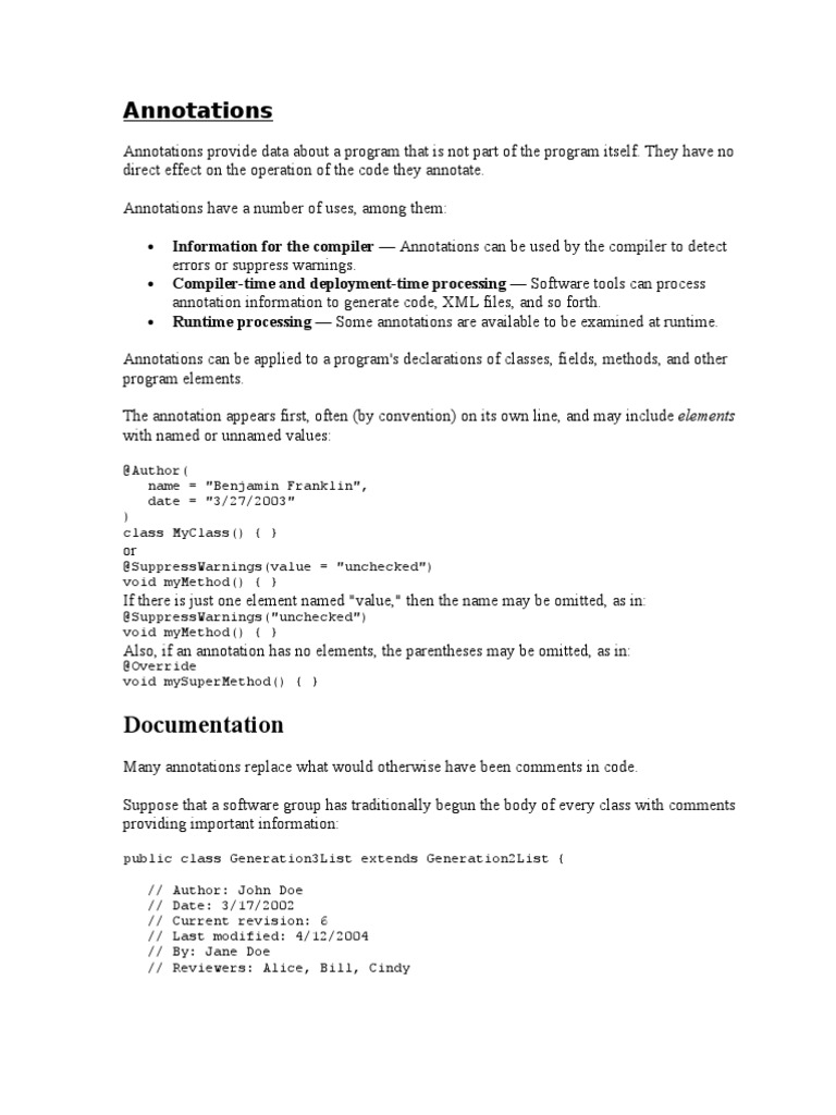 Many annotations replace what would otherwise have been comments in code. Suppose that a software group has traditionally begun the body of every class with comments providing important information: