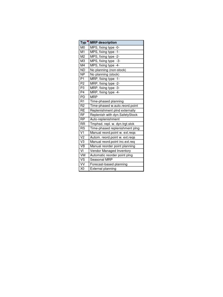 MRP description MPS, fixing type -0MPS, fixing type -1MPS, fixing type -2MPS, fixing type -3MPS, fixing type -4No planning (non-stock) No planning (stock) MRP, fixing type -1MRP, fixing type -2MRP, fixing type -3MRP, fixing type -4MRP Time-phased planning Time-phased w.auto.reord.point Replenishment plnd externally Replenish with dyn.SafetyStock Auto-replenishment Tmphsd. repl. w. dyn.trgt.stck Time-phased replenishment plng Manual reord.point w. ext.reqs Autom. reord.point w. ext.reqs Manual reord.point inc.ext.req Manual reorder point planning Vendor Managed Inventory Automatic reorder point plng Seasonal MRP Forecast-based planning External planning