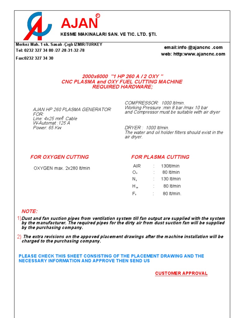 2000x6000 "1 HP 260 A / 2 OXY " CNC PLASMA and OXY FUEL CUTTING MACHINE REQUIRED HARDWARE;