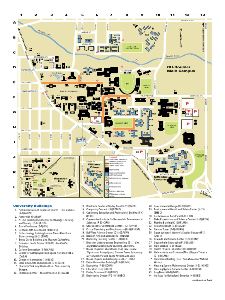 Nuclear Physics Laboratory (K-2) (NPL) Old Main (E-4) (MAIN) Page Foundation Center (D-3) (PFDC) Police and Parking Services (G-12) (PDPS) Porter Biosciences (E-7) (PORT) Power House (F-6) (POWR) Ramaley Biology (E-6) (RAMY) Regent Administrative Center (I-8) (RGNT) Regent Drive AutoPark (G-12) (RPRK) Research Laboratory, Rose Litman RL1 (J-1) (LITR) Research Laboratory (K-1) (RL2) Research Laboratory, Life Science RL4 (K-1) (LSRL) Research Laboratory, RL6 (Marine Street Science Center) (J-2) (MSSC) 83. Research Park Advanced Technologies Center (L-4) (USW) 84. Research Park Greenhouse (K-1) (GH-3) 85. Sommers-Bausch Observatory (I-11) (OBSV) 86. Speech, Language, and Hearing Sciences (I-11) (SLHS) 87. Stadium Building (E-8) (STAD) 88. Stadium Ticket Building (F-9) (STTB) 89. Student Recreation Center (D-6/7) (REC) 90. Sybase (K-3) (SYBS) 91. Telecommunications Building (G-6) (TCOM) 92. Temporary Building No.1 (D-6) (TB01) 93. Transportation Center (J-2) (TRAN) 94. University Administrative Center and Annex (I-7) (UCTR) 95. University Club (H-6) (CLUB) 96. University Memorial Center (G-5) (UMC) 97. University Theatre (including Charlotte York Irey Studios) (F-4) (THTR) 98. Visual Arts Complex (G-6) (VAC) 99. Wardenburg Health Center (H-7) (WARD) 1 00. Woodbury Arts and Sciences (E-5) (WDBY) 1 01. Wolf Law Building (L-12) (WLFL)