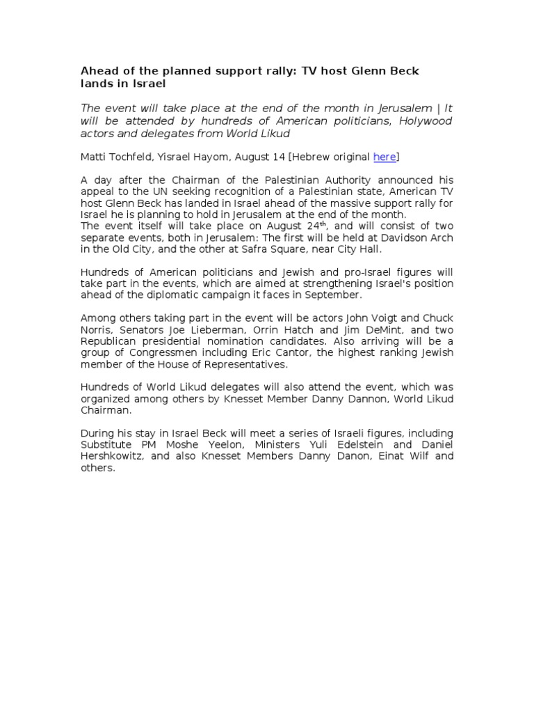 Yisrael Hayom Aug14-11 (Glenn Beck ENG)