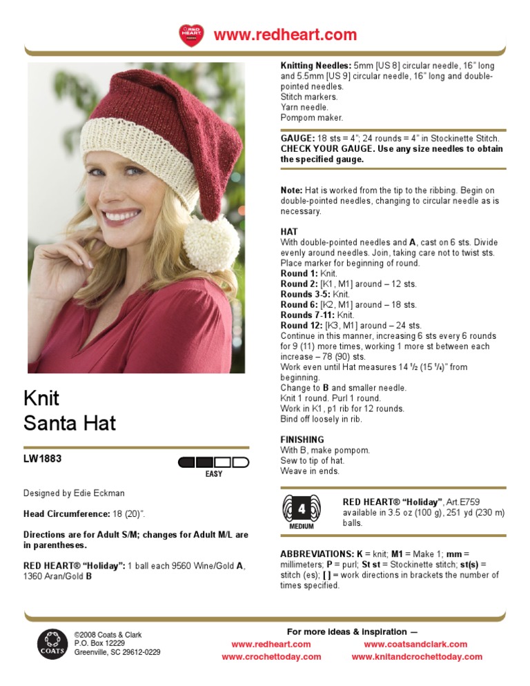 Knitting Needles: 5mm [US 8] circular needle, 16 long and 5.5mm [US 9] circular needle, 16 long and doublepointed needles. Stitch markers. Yarn needle. Pompom maker. GAUGE: 18 sts = 4; 24 rounds = 4 in Stockinette Stitch. CHECK YOUR GAUGE. Use any size needles to obtain the specified gauge. Note: Hat is worked from the tip to the ribbing. Begin on double-pointed needles, changing to circular needle as is necessary. HAT With double-pointed needles and A, cast on 6 sts. Divide evenly around needles. Join, taking care not to twist sts. Place marker for beginning of round. Round 1: Knit. Round 2: [K1, M1] around 12 sts. Rounds 3-5: Knit. Round 6: [K2, M1] around 18 sts. Rounds 7-11: Knit. Round 12: [K3, M1] around 24 sts. Continue in this manner, increasing 6 sts every 6 rounds for 9 (11) more times, working 1 more st between each increase 78 (90) sts. Work even until Hat measures 14 1/2 (15 1/4) from beginning. Change to B and smaller needle. Knit 1 round. Purl 1 round. Work in K1, p1 rib for 12 rounds. Bind off loosely in rib. FINISHING With B, make pompom. Sew to tip of hat. Weave in ends. RED HEART Holiday, Art.E759 available in 3.5 oz (100 g), 251 yd (230 m) balls. ABBREVIATIONS: K = knit; M1 = Make 1; mm = millimeters; P = purl; St st = Stockinette stitch; st(s) = stitch (es); [ ] = work directions in brackets the number of times specified.