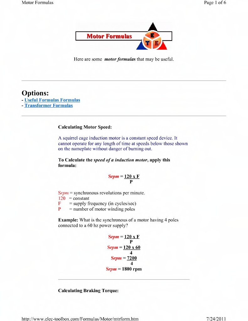 Calculating Motor Speed: A squirrel cage induction motor is a constant speed device. It cannot operate for any length of time at speeds below those shown on the nameplate without danger ofbumping out. Calculating Braking Torque: Full-load motor torque is calculated To Determine the required braking torque of a motor.