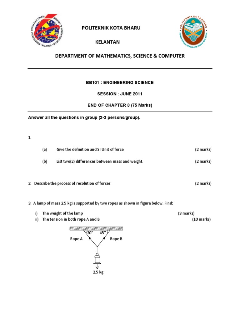 BB101 : ENGINEERING SCIENCE SESSION : JUNE 2011 END OF CHAPTER 3 (75 Marks) Answer all the questions in group (2-3 persons/group).
