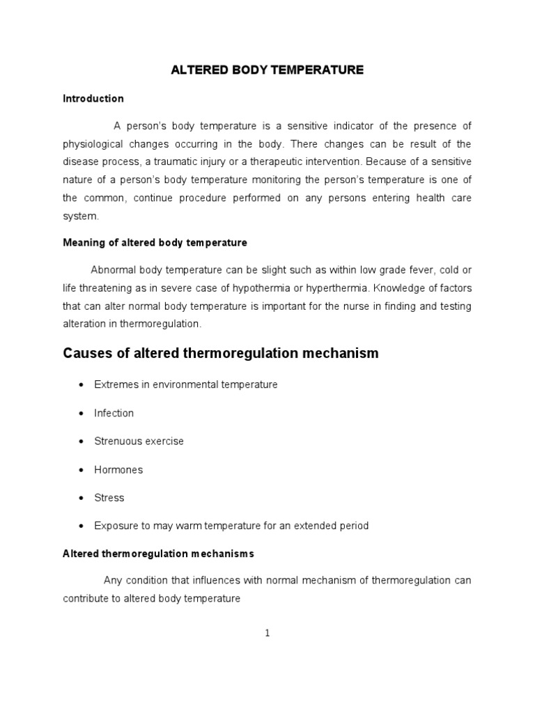 Introduction A persons body temperature is a sensitive indicator of the presence of physiological changes occurring in the body. There changes can be result of the disease process, a traumatic injury or a therapeutic intervention. Because of a sensitive nature of a persons body temperature monitoring the persons temperature is one of the common, continue procedure performed on any persons entering health care system. Meaning of altered body temperature Abnormal body temperature can be slight such as within low grade fever, cold or life threatening as in severe case of hypothermia or hyperthermia. Knowledge of factors that can alter normal body temperature is important for the nurse in finding and testing alteration in thermoregulation.