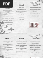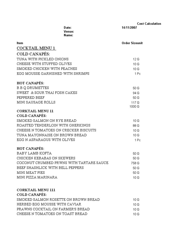 TUNA WITH PICKLED ONIONS CHEESE WITH STUFFED OLIVES SMOKED CHICKEN WITH PEACHES EGG MOUSSE GARNISHED WITH SHRIMPS HOT CANAPS: B.B.Q DRUMETTES SWEET & SOUR THAI FOSH CAKES PEPPERED BEEF MINI SAUSAGE ROLLS CORKTAIL MENU 11 COLD CANAPS: SMOKED SALMON ON RYE BREAD ROASTED TENDERLOIN WITH GHERKINGS CHEESE N TOMATOES ON CRECKER BISCUITS TUNA MAYONNAISE ON BROWN BREAD EGG N ASPARAGUS WITH OLIVES HOT CANAPS: BABY LAMB KOFTA CHICKEN KEBABAS ON SKEWERS COCONUT CRUMBED PRWNS WITH TARTARE SAUCE BEEF SHASHLICK WITH BELL PEPPERS MINI MEAT PIES MINI PIZZA MARINARA CORKTAIL MENU 111 COLD CANAPS: SMOKED SALMON ROSETTE ON BROWN BREAD HERBED EGG MOUSSE WITH CAVIAR PRAWNS COCKTAIL ON FARMER'S BREAD CHEESE N TOMATOES ON TOAST BREAD