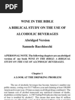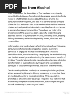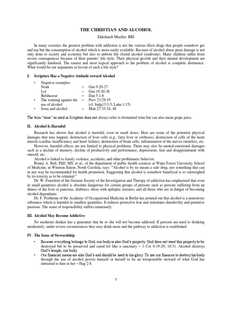 The term wine as used in Scripture does not always refer to fermented wine but can also mean grape juice. II. Alcohol Is Harmful Research has shown that alcohol is harmful, even in small doses. Here are some of the potential physical damages that may happen: destruction of liver cells (e.g., fatty liver or cirrhosis), destruction of cells of the heart muscle (cardiac insufficiency and heart failure), destruction of brain cells, inflammation of the nerves (neuritis), etc. However, harmful effects are not limited to physical problems. There may also be mental-emotional damages such as a decline of memory, decline of productivity and performance, depressions, fear and disappointment with oneself, etc. Alcohol is linked to family violence, accidents, and other problematic behavior. Ronny A. Bell, PhD, MS, et al., of the department of public health sciences at Wake Forest University School of Medicine, in Winston-Salem, North Carolina, says: Alcohol is by no means a safe drug, nor something that can in any way be recommended for health promotion. Suggesting that alcohol is somehow beneficial is so outweighed by its toxicity as to be criminal. Dr. W. Feuerlein of the German Society of the Investigation and Therapy of addiction has emphasized that even in small quantities alcohol is absolute dangerous for certain groups of persons such as persons suffering from an illness of the liver or pancreas, diabetics, those with epileptic seizures, and all those who are in danger of becoming alcohol dependants. Dr. F. Portheine of the Academy of Occupational Medicine in Berlin has pointed out that alcohol is a neurotoxic substance which is harmful in smallest quantities. It reduces protective fear and stimulates daredevilry and primitive passions. The sense of responsibility suffers immensely. III. Alcohol May Become Addictive No moderate drinker has a guarantee that he or she will not become addicted. If persons are used to drinking moderately, under severe circumstances they may drink more and the pathway to addiction is established. IV. The Issue of Stewardship Because everything belongs to God, our body is also Gods property. God does not want this property to be destroyed but to be preserved and cared for like a sanctuary 1 Cor 6:19-20; 10:31. Alcohol destroys Gods temple, our body. Our financial means are also Gods and should be used to his glory. To use our finances to destroy his body through the use of alcohol proves himself or herself to be an irresponsible steward of what God has entrusted to him or her Hag 2:8.