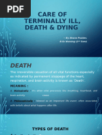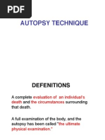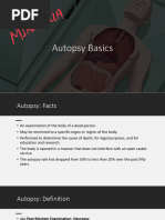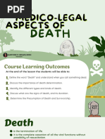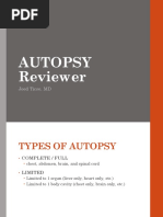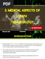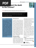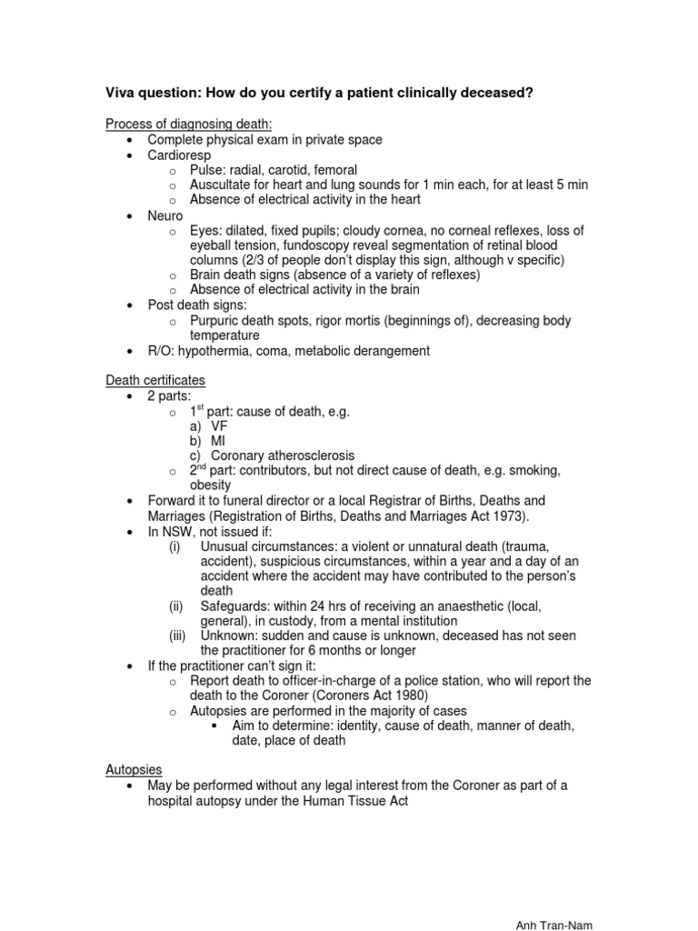 Process of diagnosing death: Complete physical exam in private space Cardioresp o Pulse: radial, carotid, femoral o Auscultate for heart and lung sounds for 1 min each, for at least 5 min o Absence of electrical activity in the heart Neuro o Eyes: dilated, fixed pupils; cloudy cornea, no corneal reflexes, loss of eyeball tension, fundoscopy reveal segmentation of retinal blood columns (2/3 of people dont display this sign, although v specific) o Brain death signs (absence of a variety of reflexes) o Absence of electrical activity in the brain Post death signs: o Purpuric death spots, rigor mortis (beginnings of), decreasing body temperature R/O: hypothermia, coma, metabolic derangement Death certificates 2 parts: o 1st part: cause of death, e.g. a) VF b) MI c) Coronary atherosclerosis o 2nd part: contributors, but not direct cause of death, e.g. smoking, obesity Forward it to funeral director or a local Registrar of Births, Deaths and Marriages (Registration of Births, Deaths and Marriages Act 1973). In NSW, not issued if: (i) Unusual circumstances: a violent or unnatural death (trauma, accident), suspicious circumstances, within a year and a day of an accident where the accident may have contributed to the persons death (ii) Safeguards: within 24 hrs of receiving an anaesthetic (local, general), in custody, from a mental institution (iii) Unknown: sudden and cause is unknown, deceased has not seen the practitioner for 6 months or longer If the practitioner cant sign it: o Report death to officer-in-charge of a police station, who will report the death to the Coroner (Coroners Act 1980) o Autopsies are performed in the majority of cases Aim to determine: identity, cause of death, manner of death, date, place of death Autopsies May be performed without any legal interest from the Coroner as part of a hospital autopsy under the Human Tissue Act