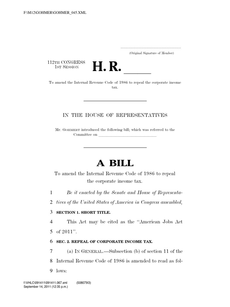 To amend the Internal Revenue Code of 1986 to repeal the corporate income tax. 1 Be it enacted by the Senate and House of Representa-