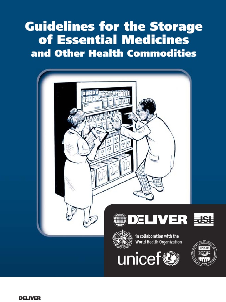 DELIVER DELIVER, a five-year worldwide technical assistance support contract, is funded by the Commodities Security and Logistics Division (CSL) of the Office of Population and Reproductive Health of the Bureau for Global Health (GH) of the U.S. Agency for International Development (USAID). Implemented by John Snow, Inc. (JSI), (contract no. HRN-C-00-00-00010-00), and subcontractors (Manoff Group; Program for Appropriate Technology in Health [PATH]; Social Sectors Development Strategies, Inc.; Synaxis, Inc.; Boston University Center for International Health; Crown Agents Consultancy, Inc.; Harvard University Health Systems Group; and Social Sectors Development Strategies), DELIVER strengthens the supply chains of health and family planning programs in developing countries to ensure the availability of critical health products for customers. DELIVER also provides technical support to USAIDs central contraceptive procurement and management, and analysis of USAIDs central commodity management information system (NEWVERN). This document does not necessarily represent the views or opinions of USAID or the World Health Organization. It may be reproduced if credit is given to John Snow, Inc./DELIVER. Recommended Citation John Snow, Inc./DELIVER in collaboration with the World Health Organization. Guidelines for the Storage of Essential Medicines and Other Health Commodities. 2003. Arlington, Va.: John Snow, Inc./DELIVER, for the U.S. Agency for International Development. Abstract Maintaining proper storage conditions for health commodities is vital to ensuring their quality. Product expiration dates are based on ideal storage conditions and protecting product quality until their expiration date is important for serving customers and conserving resources. Guidelines for the Storage of Essential Medicines and Other Health Commodities is a practical reference for those managing or involved in setting up a storeroom or warehouse. The guide contains written directions and clear illustrations on receiving and arranging commodities; special storage conditions; tracking commodities; maintaining the quality of the products; constructing and designing a medical store; waste management; and resources. It was written to meet the needs of district-level facilities; however, the guidelines and information it contains apply to any storage facility, of any size, in any type of environment.
