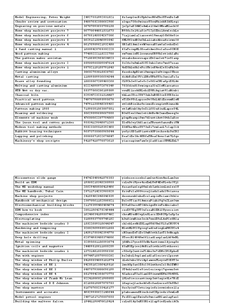 Gear wheels and gear cutting Gear cutting practice Precision lead screws Ignition equipment WPS 37 - Dividing Making rifle barrels The shop wisdom of RK 2 WPS 27 - Spindles The beginners guide to fitting Drilling and thread cutting HTM a 8-inch bench late The compact lathe Complete practical machinist Strictly I. C. (all issues) Basic metal casting Metal work and enameling Lost wax casting Iron melting cupola furnace The art of casting in iron Building a small lathe Castings Tinplate work How to use tin can metal Engraving metal Steam and stirling engine 1 Steam and stirling engine 2 Plastic for modelers Shop theory