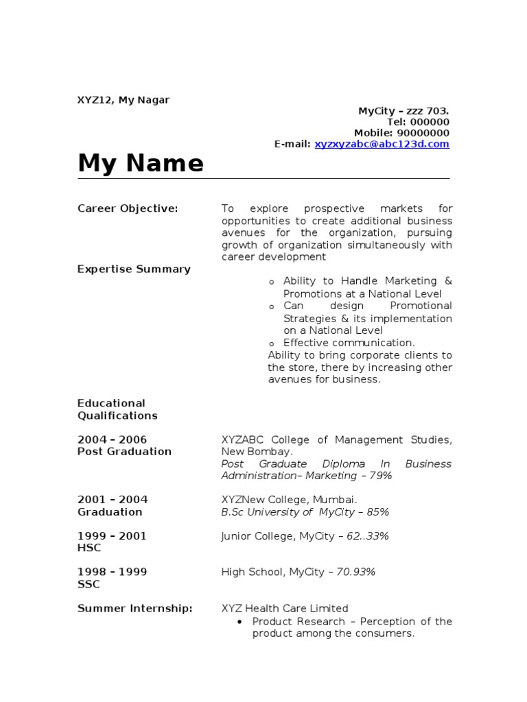 Career Objective: To explore prospective markets for opportunities to create additional business avenues for the organization, pursuing growth of organization simultaneously with career development o Ability to Handle Marketing & Promotions at a National Level o Can design Promotional Strategies & its implementation on a National Level o Effective communication. Ability to bring corporate clients to the store, there by increasing other avenues for business. Educational Qualifications 2004 2006 Post Graduation XYZABC College of Management Studies, New Bombay. Post Graduate Diploma In Business Administration Marketing 79% XYZNew College, Mumbai. [Link] University of MyCity 85% Junior College, MyCity 62..33% High School, MyCity 70.93% XYZ Health Care Limited Product Research Perception of the product among the consumers.