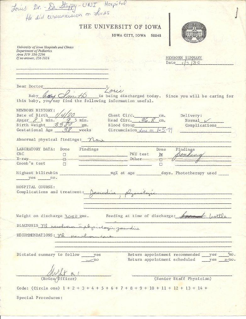 01.07.1980. Newborn Summary. Lucas Daniel Smith. University of Iowa Hospitals and Clinics.