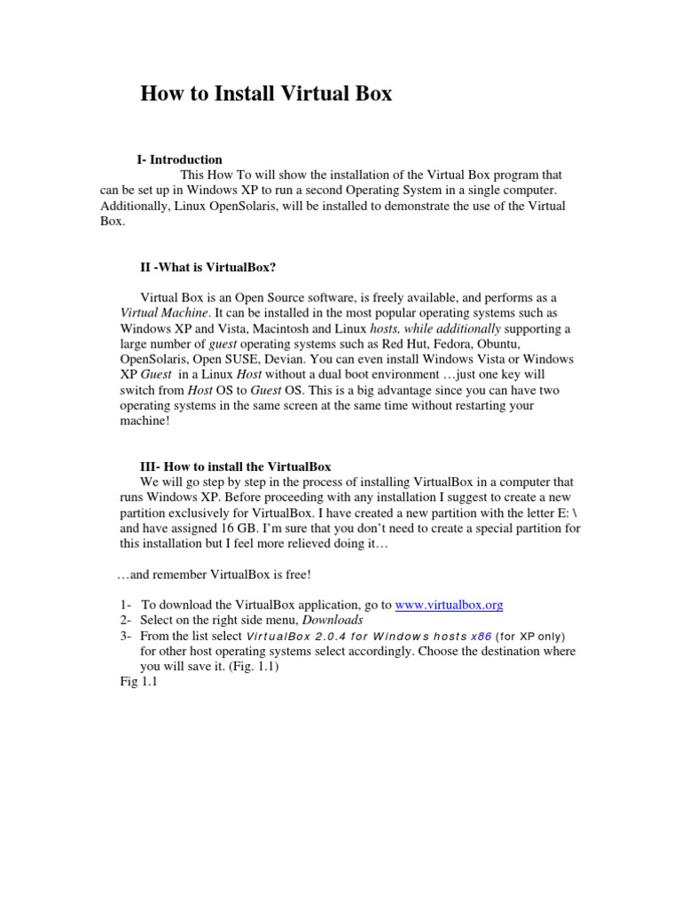 I- Introduction This How To will show the installation of the Virtual Box program that can be set up in Windows XP to run a second Operating System in a single computer. Additionally, Linux OpenSolaris, will be installed to demonstrate the use of the Virtual Box.