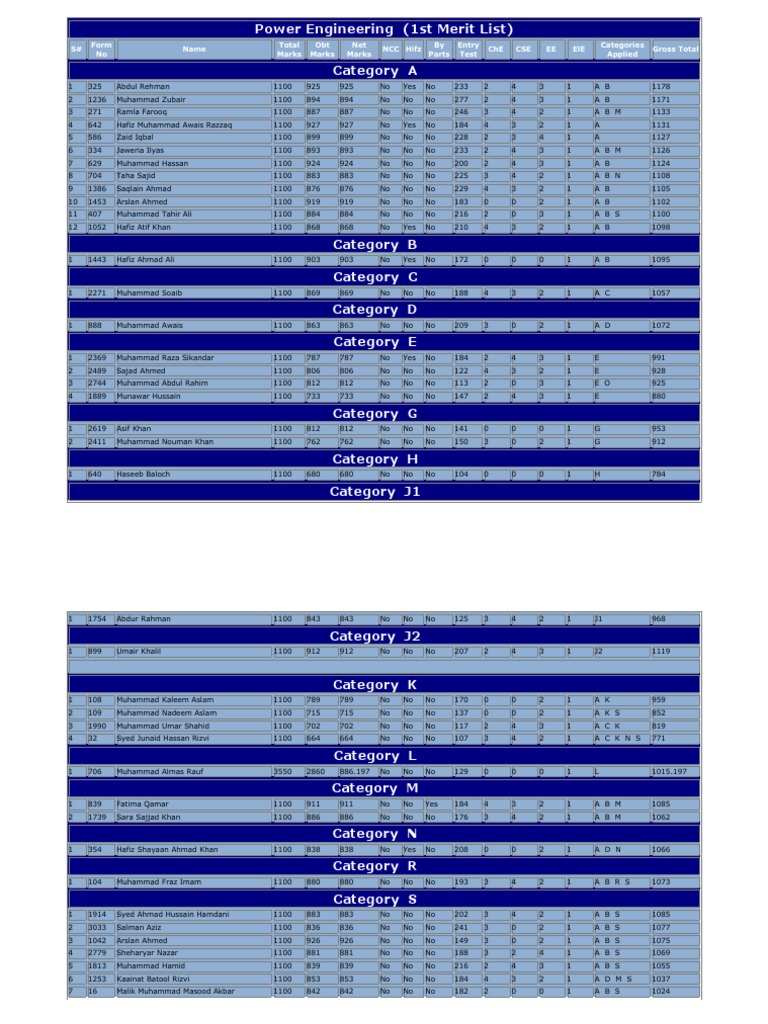 The document appears to be a merit list for admissions to a Power Engineering program. It includes the names and admission scores of applicants across several categories (A to S). The highest scoring applicants are listed at the top, with Abdul Rehman scoring the highest gross total of 1178 points, followed by Muhammad Zubair with 1171 points, and Ramla Farooq with 1133 points. The list provides each applicant's test scores and categories applied to.