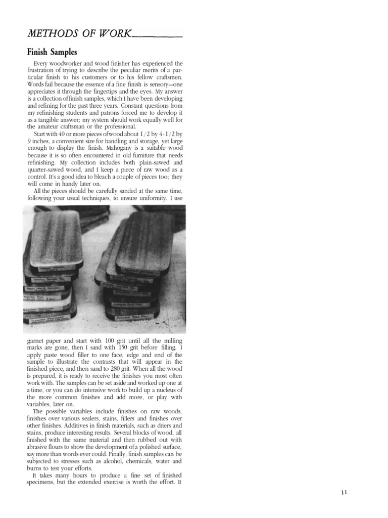 garnet paper and start with 100 grit until all the milling marks are gone, then I sand with 150 grit before filling. I apply paste wood filler to one face, edge and end of the sample to illustrate the contrasts that will appear in the finished piece, and then sand to 280 grit. When all the wood is prepared, it is ready to receive the finishes you most often work with. The samples can be set aside and worked up one at a time, or you can do intensive work to build up a nucleus of the more common finishes and add more, or play with variables, later on. The possible variables include finishes on raw woods, finishes over various sealers, stains, fillers and finishes over other finishes. Additives in finish materials, such as driers and stains, produce interesting results. Several blocks of wood, all finished with the same material and then rubbed out with abrasive flours to show the development of a polished surface, say more than words ever could. Finally, finish samples can be subjected to stresses such as alcohol, chemicals, water and burns to test your efforts. It takes many hours to produce a fine set of finished specimens, but the extended exercise is worth the effort. It
