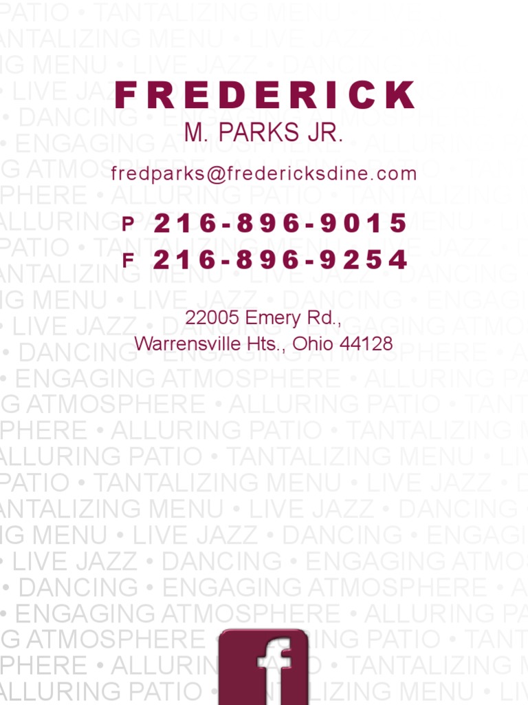 ENGAGIN LIVE JAZZ DANCING R I C K ATMOS F R E D E ENGAGING DANCING ENGAGING ATMOSPHERE A M. PARKS JR. ENGAGING ATMOSPHERE ALLURING PA NG ATMOSPHERE ALLURING PATIO TANT fredparks@fredericksdine.com PHERE ALLURING PATIO TANTALIZING M ALLURINGP 2 1 6 -TANTALIZING5 PATIO 8 9 6 - 9 0 1 MENU LIV PATIO TANTALIZING9 6 - 9 2 5 4 JAZZ D MENU LIVE F 216-8 ANTALIZING MENU LIVE JAZZ DANCING NG MENU LIVE JAZZ DANCING ENGAGIN 22005 Emery Rd., LIVE JAZZ DANCING ENGAGING ATMOS DANCINGWarrensville Hts., Ohio 44128 ENGAGING ATMOSPHERE A ENGAGING ATMOSPHERE ALLURING PA NG ATMOSPHERE ALLURING PATIO TANT PHERE ALLURING PATIO TANTALIZING M ALLURING PATIO TANTALIZING MENU LIV PATIO TANTALIZING MENU LIVE JAZZ D ANTALIZING MENU LIVE JAZZ DANCING NG MENU LIVE JAZZ DANCING ENGAGIN LIVE JAZZ DANCING ENGAGING ATMOS DANCING ENGAGING ATMOSPHERE A ENGAGING ATMOSPHERE ALLURING PA NG ATMOSPHERE ALLURING PATIO TANT PHERE ALLURING PATIO TANTALIZING M ALLURING PATIO TANTALIZING MENU LIV PATIO TANTALIZING MENU LIVE JAZZ D ANTALIZING MENU LIVE JAZZ DANCING NG MENU LIVE JAZZ DANCING ENGAGIN @ FREDERICKS-WINE-AND-DINE LIVE JAZZ DANCING ENGAGING ATMOS DANCING ENGAGING ATMOSPHERE A ENGAGING ATMOSPHERE ALLURING PA