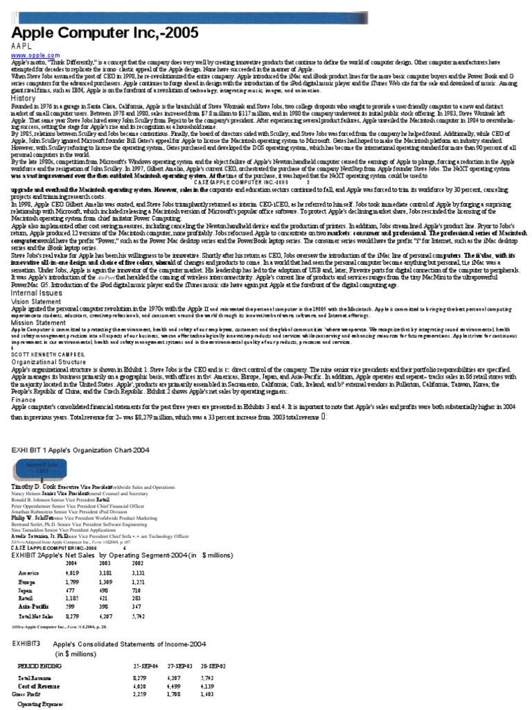 Apple computer's consolidated financial statements for the past three years are presented in Exhibits 3 and 4. It is important to note that Apple's sales and profits were both substantially higher in 2004 than in previous years. Total revenue for 2~ was $8,279 million, which was a 33 percent increase from 2003 total revenue 0: