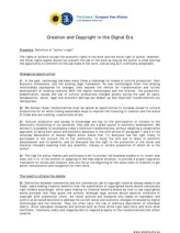 §22. We do support Creative Commons as a good possibility for creatives to share their works whenever wanted.§23. Up until twenty years ago, copyright was hardly anything that concerned ordinary people. Therules about exclusivity on the production of copies where aimed at commercial actors, who had themeans to, for example, print books or press records. Private citizens who wanted to copy a poem andsend to their loved one, or copy a record to cassette and give it to a friend, did not have to worryabout being in breach of copyright. In practice, anything you had the technical means to do as anormal person, you could do without risk of any punishment.But today, copyright has evolved to a position where it imposes serious restrictions on what ordinarycitizens can do in their every-day life. As technological progress has made it easier for ordinary peopleto enjoy and share culture, copyright legislation has moved in the opposite direction.