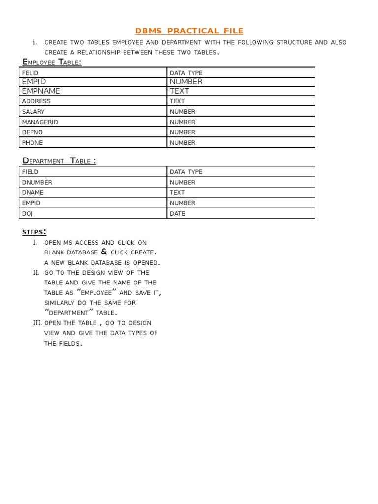 FIELD DNUMBER DNAME EMPID DOJ STEPS: DATA TYPE NUMBER TEXT NUMBER DATE
