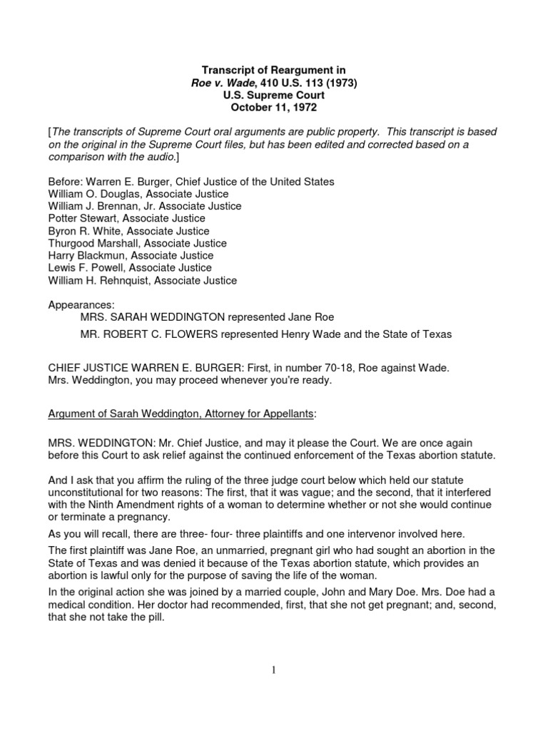 subsequent pages, some of the changing medical statistics available regarding the procedureof abortion.For example, that brief points out that the overall maternal death rate from legal abortion inNew York dropped to 3.7 per 100,000 abortions in the last half of 1971. And that that, in fact,is less than half the death rate associated with live delivery for women.That, in fact, the maternal morbid...mortality rate has decreased by about two-thirds to a recordlow in New York in 1971. That now, in 1971, New York recorded the lowest infant mortality rateever in that State.That during the first 18 months of-well, from July 1st, 1970, to December 31st, 1971, out-of-wedlock pregnancies have dropped by 14 percent.We now have other statistics coming from California, and other states, that show that not onlyhas the overall birth rate declined, but the welfare birth rate has also declined accordingly.As to the women, this is their only forum. They are in a very unique situation for severalreasons.First, because of the very nature of the interest involved, their primary interest being theinterest associated with the question of whether or not they will be forced by the State tocontinue an unwanted pregnancy.In our original brief we alleged a number of constitutional grounds. The main ones that we arerelying on before this Court are the Fifth, the Ninth, and the Fourteenth Amendments.There is a great body of precedent. Certainly we cannot say that there is in the Constitution-sostated-the right to an abortion. But neither is there stated the right to travel, or some of theother very basic rights that this Court has held are under the United States Constitution.The Court has in the past, for example, held that it is the right of the parents, and of theindividual, to determine whether or not they will send their child to private school; whether ornot their children will be taught foreign languages; whether or not they will have offspring-theSkinner case; whether-the right to determine for themselves whom they will marry-the Lovingcase; and even in Boddie v. Connecticut, the choice of saying that marriage itself is soimportant that the State cannot interfere with termination of a marriage, just because thewoman is unable to pay the cost.Griswold, of course, is the primary case, holding that the State could not interfere in thequestion of whether or not a married couple would use birth control. And, since then, thisCourt, of course, has held that the individual has the right to determine-whether they aremarried or single-- whether they will use birth control.So there is a great body of cases decided in the past by this Court in the areas of marriage,sex, contraception, procreation, child-bearing, and education of children, which says that thereare certain things that are so much a part of the individual concern that they should be left tothe determination of the individual.One of the cases decided since our last argument September 13th was the secondConnecticut case, Abele v. Markle, which Judge...JUSTICE STEWART: Newman.