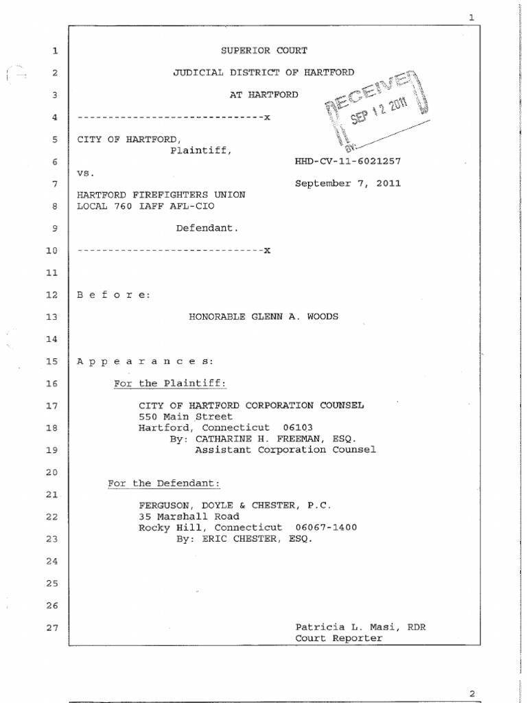 HARTFORD Firefighters UNION Local 760 IAFF AFL-CIO Defendant. 7, vs. E: HONORABLE GLENN A. WOODS A P pea ran for the plaintiff: city of harford corporation counsel. Mr. Chester: there was a …