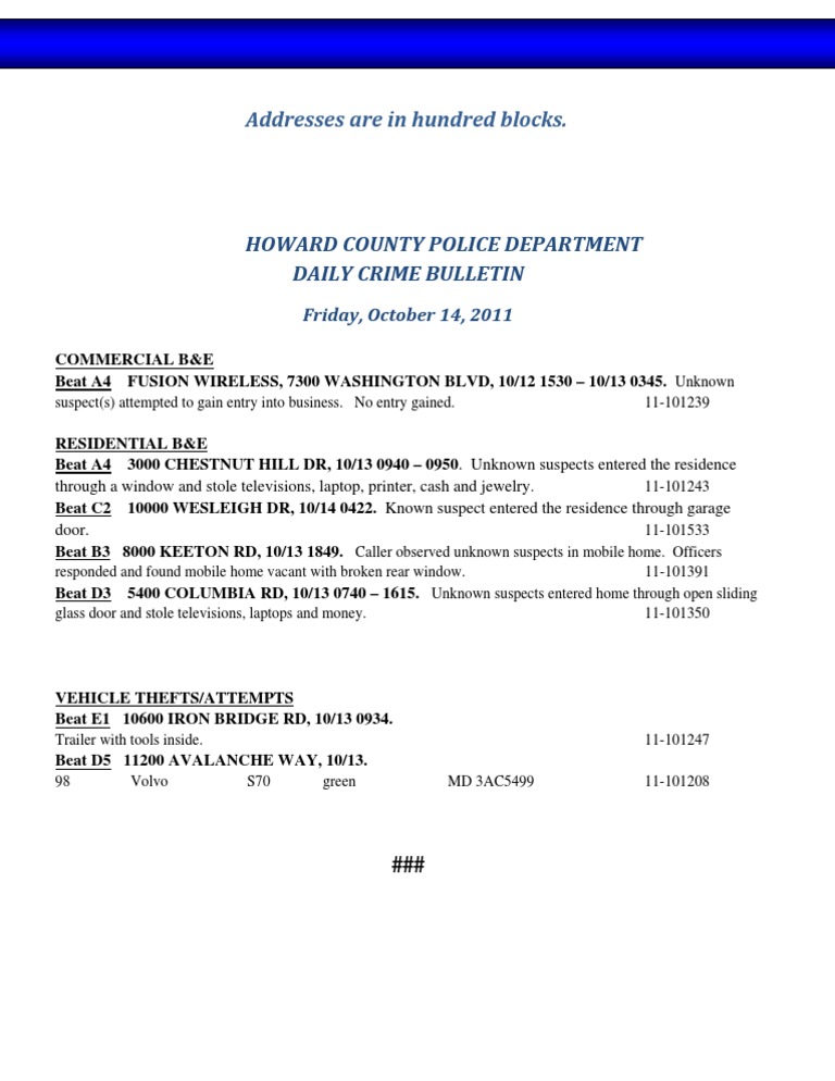 HOWARDCOUNTYPOLICEDEPARTMENT DAILYCRIMEBULLETIN