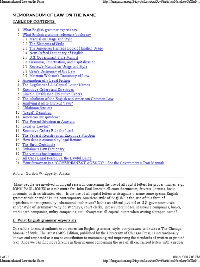 This document discusses the use of writing proper names in all capital letters. It summarizes the views of several English grammar and style references, as well as legal dictionaries, on the topic. Most style guides indicate it is not conventional grammar to write anything, including names, in all capital letters. However, government agencies and courts consistently use all capital letters for names. The document aims to determine why this discrepancy exists in legal contexts.