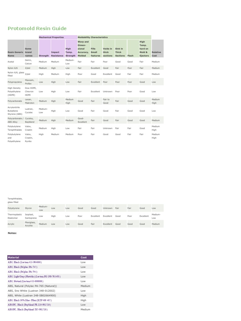 Mechanical Properties Moldability Characteristics Warp and DimenSome Resin Generic brand Name Acetal Nylon 6/6 Nylon 6/6, glass filled Polypropylene High Density Polyethylene (HDPE) Polycarbonate Acrylonitrile Butadiene Styrene (ABS) names Delrin, Celcon Zytel Zytel Maxxam, Profax Dow HDPE, Chevron HDPE Lexan, Makrolon Lustran, Cycolac Medium High Medium High Good Fair Fair to Good Fair Good Good Medium High Low High Low Fair Excellent Unknown Poor Poor Good Low Strength Medium Medium High Impact Resistance Medium High Medium High Temp. Strength MediumLow Low High sional Accuracy, Molded Fair Fair Poor Fills Small features Fair Excellent Good Voids in thick sections Poor Good Excellent Sink in Thick Sections Good Fair Good Flash Good Poor Fair High Temp. hard on Mold & Ejectors Fair Fair Fair Relative Cost Medium Medium Medium
