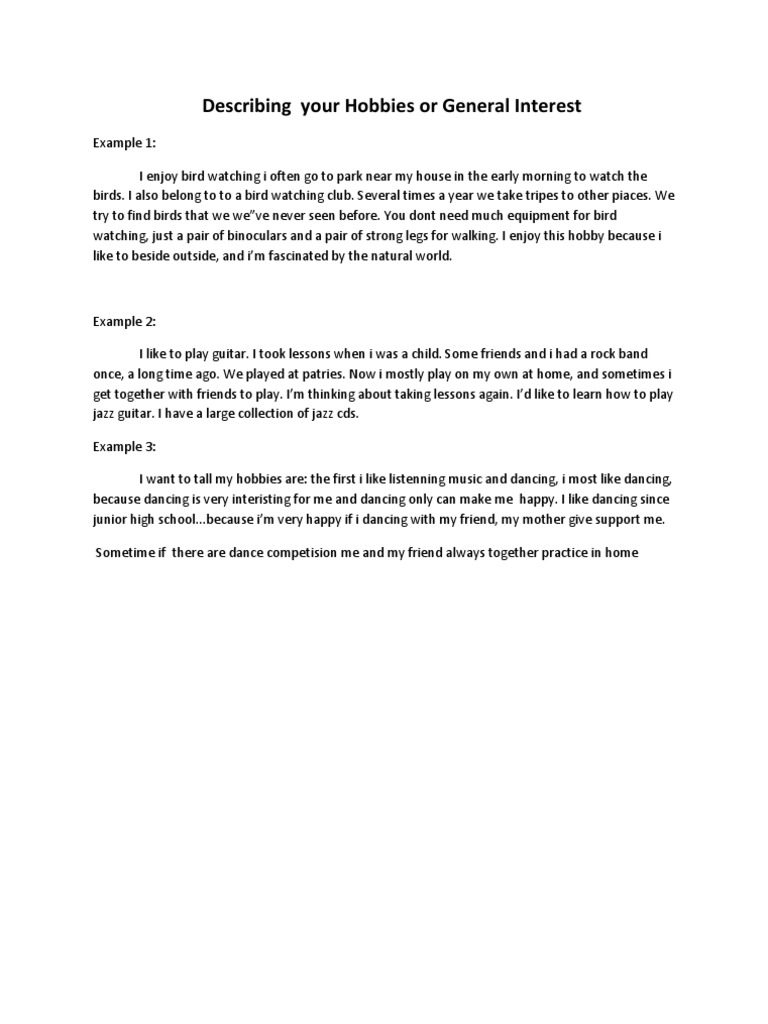 Example 2: I like to play guitar. I took lessons when i was a child. Some friends and i had a rock band once, a long time ago. We played at patries. Now i mostly play on my own at home, and sometimes i get together with friends to play. Im thinking about taking lessons again. Id like to learn how to play jazz guitar. I have a large collection of jazz cds. Example 3: I want to tall my hobbies are: the first i like listenning music and dancing, i most like dancing, because dancing is very interisting for me and dancing only can make me happy. I like dancing since junior high school...because im very happy if i dancing with my friend, my mother give support me. Sometime if there are dance competision me and my friend always together practice in home