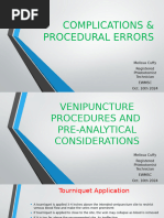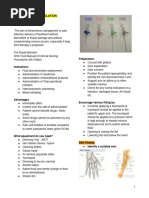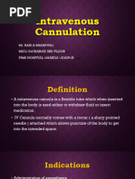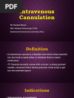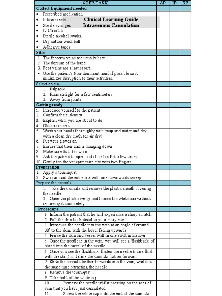 ion Iv Cannula Sterile alcohol swabs. Dry cotton-wool ball Adhesive tapes Sites 1. The forearm veins are usually best. 2. The dorsum of the hand 3. Foot veins are a last resort. Use the patient's Non-dominant hand if possible so it minimizes disruption to their activities. Select a vein 1. Palpable 2. Runs straight for a few centimeters 3. Away from joints Getting ready 1. Introduce yourself to the patient 2. Confirm their identity 3. Explain what you are about to do 4. Obtain consent. 5. Wash your hands thoroughly with soap and water and dry with a clean dry cloth (or air dry). 6. Put your gloves on 7. Ensure that their arm is 'hanging down 8. Make sure that it is warm 9. Ask the patient to open and close his fist a few times 10. Gently tap the venepuncture site with two fingers. Preparation 1. Apply a tourniquet 2. Swab around the entry site with one downwards sweep. Prepare the cannula 1. Take the cannula and remove the plastic sheath covering the needle 2. Open the plastic wings and loosen the white cap without removing it completely Procedure 1. Inform the patient that he will experience a sharp scratch. 2. Pull the skin back distal to your entry site 3. Introduce the needle into the vein at an angle of around 30o to the skin, with the bevel facing upwards 4. Pierce the skin and vessel wall in one swift maneuver 5. Once the needle is in the vein, you will see a 'flashback' of blood into the barrel of the needle 6. Once you see the flashback, flatten the needle (more flush with the skin) and slide the cannula further forward 7. Slide the cannula further forwards into the vein, whilst at the same time retracting the needle 8. Remove the tourniquet . 9. Take hold of the white cap 10. Remove the needle whilst pressing on the area of vein that you have just cannulated 11. Screw the white cap onto the end of the cannula Post procedure tasks Dispose sharps Wipe off any blood