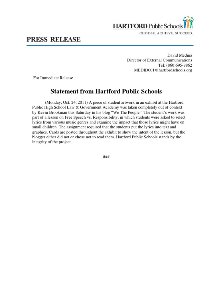 A piece of student artwork was taken completely out of context by Kevin Brookman. The student's work was part of a lesson on Free Speech vs. Responsibility. Hartford Public Schools stands by…