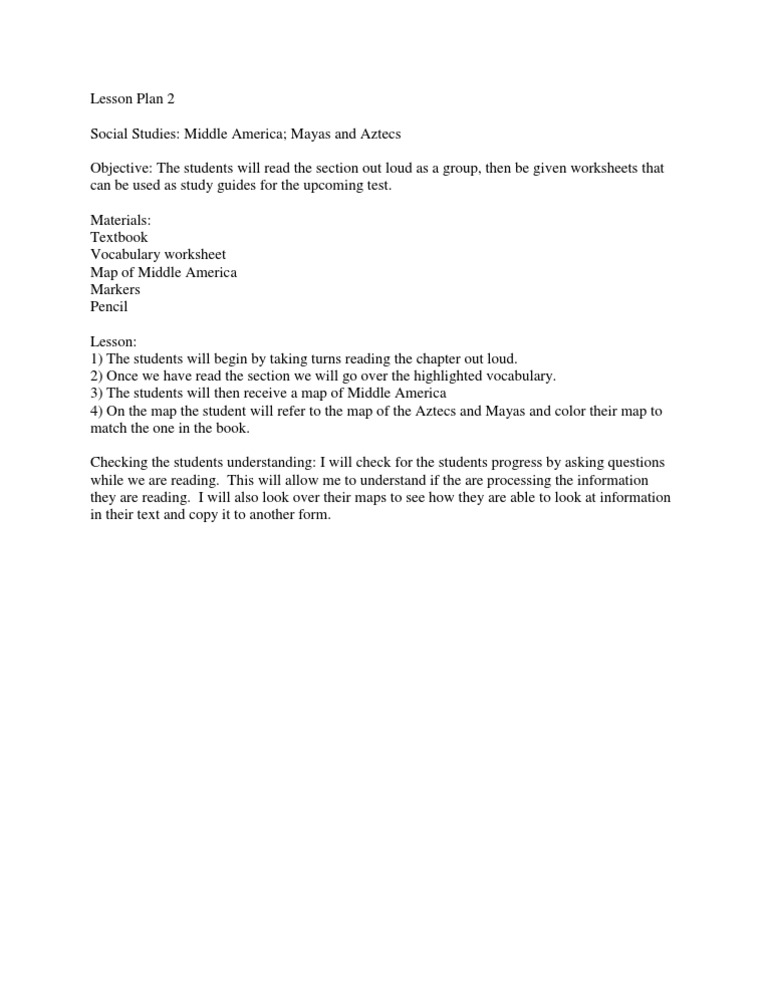section out loud as a group, then be given worksheets that can be used as study guides for the upcoming test. Materials: Textbook Vocabulary worksheet Map of Middle America Markers Pencil Lesson: 1) The students will begin by taking turns reading the chapter out loud. 2) Once we have read the section we will go over the highlighted vocabulary. 3) The students will then receive a map of Middle America 4) On the map the student will refer to the map of the Aztecs and Mayas and color their map to match the one in the book. Checking the students understanding: I will check for the students progress by asking questions while we are reading. This will allow me to understand if the are processing the information they are reading. I will also look over their maps to see how they are able to look at information in their text and copy it to another form.