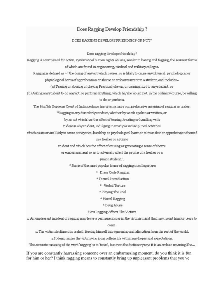 Does ragging develope friendship? Ragging is a term used for active, systematical human rights abuses, similar to hazing and fagging, the severest forms of which are found in engineering, medical and military colleges. Ragging is defined as the doing of any act which causes, or is likely to cause any physical, psychological or physiological harm of apprehension or shame or embarrassment to a student, and includes (a) Teasing or abusing of playing Practical joke on, or causing hurt to any student. or (b) Asking any student to do any act, or perform anything, which he/she would not, in the ordinary course, be willing to do or perform. The Honble Supreme Court of India perhaps has given a more comprehensive meaning of ragging as under: Ragging is any disorderly conduct, whether by words spoken or written, or by an act which has the effect of teasing, treating or handling with rudeness any student, indulging in rowdy or indisciplined activities which cause or are likely to cause annoyance, hardship or psychological harm or to raise fear or apprehension thereof in a fresher or a junior student and which has the effect of causing or generating a sense of shame or embarrassment so as to adversely affect the psyche of a fresher or a junior student.". * Some of the most popular forms of ragging in colleges are: * Dress Code Ragging * Formal Introduction * Verbal Torture * Playing The Fool * Hostel Ragging * Drug Abuse How Ragging Affects The Victim: 1. An unpleasant incident of ragging may leave a permanent scar in the victims mind that may haunt him for years to come. 2. The victim declines into a shell, forcing himself into ignominy and alienation from the rest of the world. 3. It demoralizes the victim who joins college life with many hopes and expectations. The accurate meaning of the word 'ragging' is to 'tease', but even the dictionary says it is an archaic [Link]...