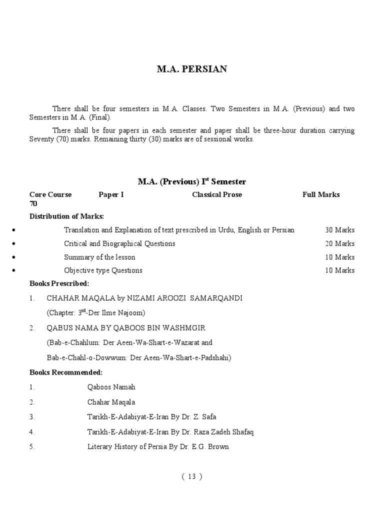 Books prescribed: Jawame-Ul-Hekayat Wa Lawame-Ur-Rawayat by Aufi Chapters: Gawahiye Murghan, Nauroz, Bahramgor, Niyat-e-khair, Sultan Mahmood Wa Mard-e- Dahqan Waqa-I-Nemat Khan Ali (Waqea-I-Aiyyam-e-Mohasera 14 Rajab 35) Tarikh-e-Adabiyat der Iran by Dr. Z. Safa Tarikh-e-Adabiyat-e-Iran by Raza Zadeh Shafaq Literary History of Persia by Dr. E.G. Brown Iran Sadyon Ke Aine Mein by Dr. Amrit Lal Ishrat
