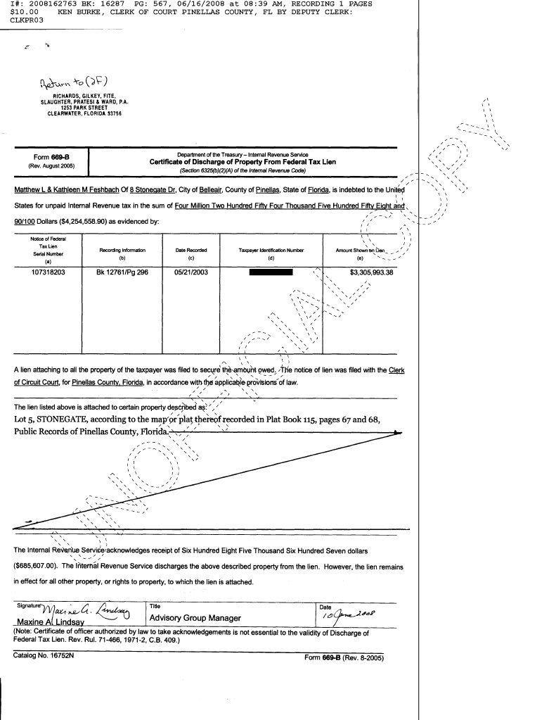 Matthew L.Feshbach & Kathleen Feshbach IRS Lien Discharge on Home Sold, Leaving IRS Lien Balance of $ 3,568,951.90