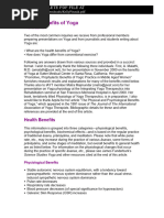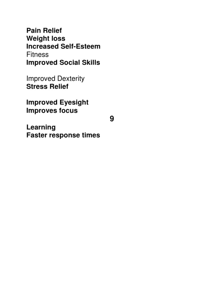 This document lists several benefits of an unspecified activity such as pain relief, weight loss, increased self-esteem, improved fitness, social skills, dexterity, stress relief, eyesight, focus, learning ability, and faster response times.