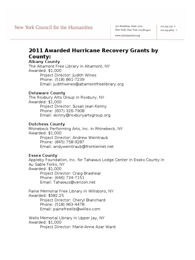 Albany County The Altamont Free Library in Altamont, NY Awarded: $1,000 Project Director: Judith Wines Phone: (518) 861-7239 Email: judithwines@altamontfreelibrary.org Delaware County The Roxbury Arts Group in Roxbury, NY Awarded: $1,000 Project Director: Susan Jean Kenny Phone: (607) 326-7908 Email: skinny@roxburyartsgroup.org Dutchess County Rhinebeck Performing Arts, Inc. in Rhinebeck, NY Awarded: $1,000 Project Director: Andrew Weintraub Phone: (845) 758-9287 Email: andyweintraub@frontiernet.net Essex County Appleby Foundation, Inc. for Tahawus Lodge Center in Essex County in Au Sable Forks, NY Awarded: $1,000 Project Director: Craig Brashear Phone: (646) 734-7151 Email: Tahawus@verizon.net Paine Memorial Free Library in Willsboro, NY Awarded: $582.25 Project Director: Cheryl Blanchard Phone: (518) 963-4478 Email: painefreelib@willex.com Wells Memorial Library in Upper Jay, NY Awarded: $1,000 Project Director: Marie-Anne Azar Ward