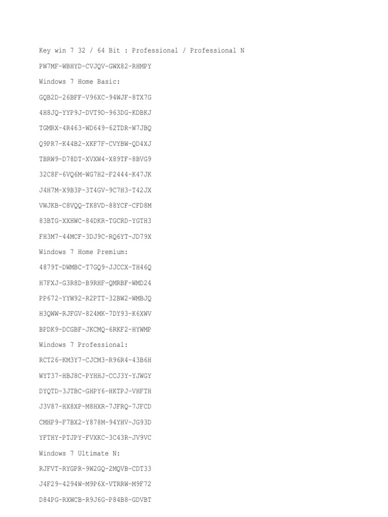 Key win 7 32 / 64 Bit : Professional / Professional N