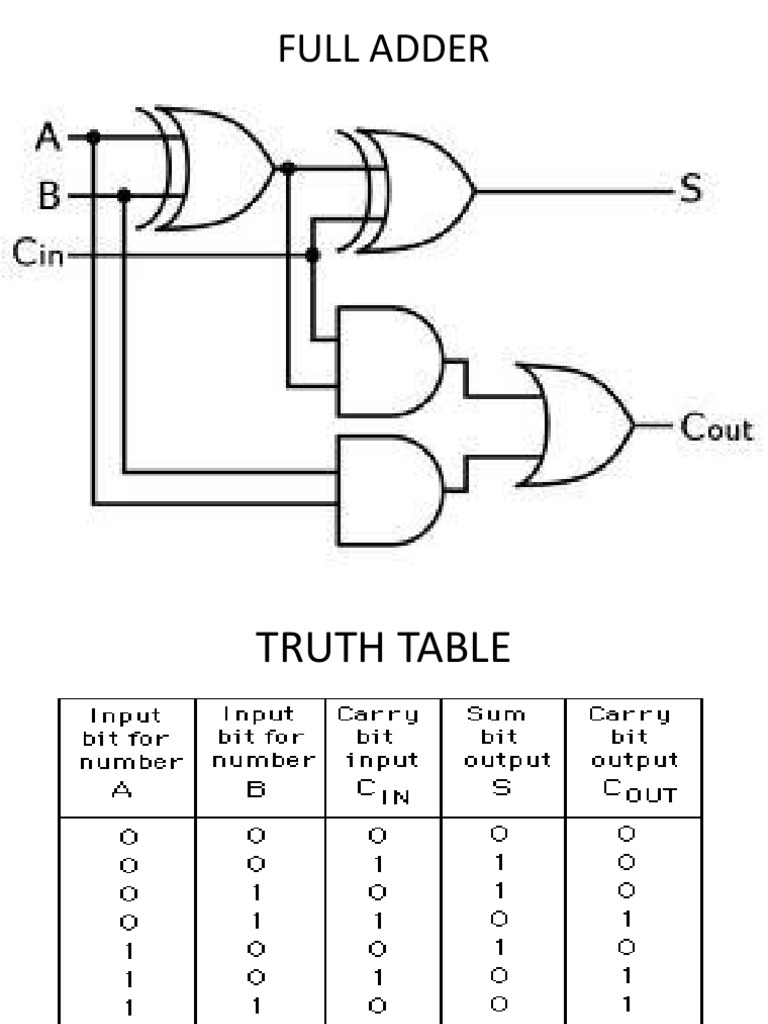 This document discusses digital logic circuits. It mentions a full adder, truth table, and half adder. It also lists several integrated circuit chip numbers for logic gates including NOT, OR, AND, NAND, and EX-OR gates.